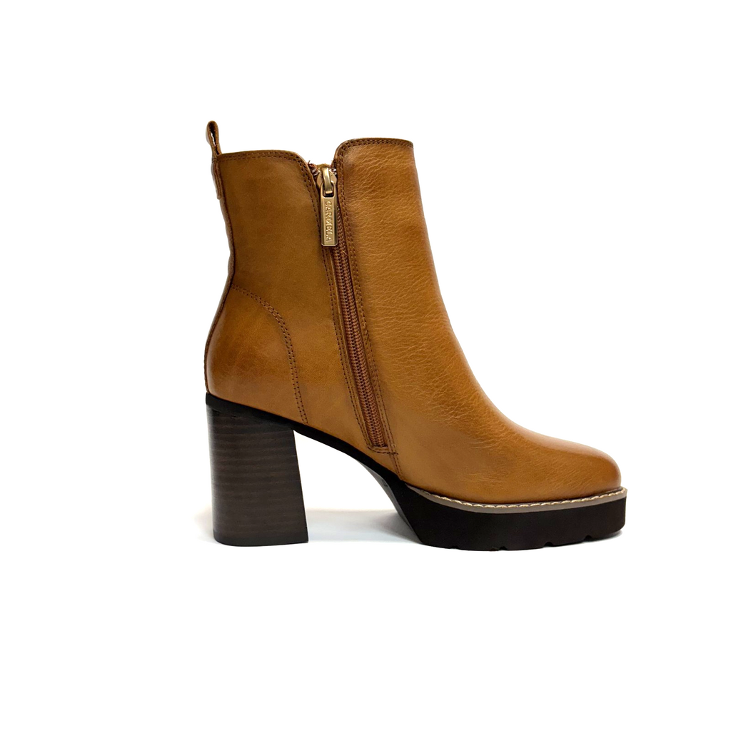 Gli stivaletti Carmela in vera pelle color cuoio, dotati di tacco alto e plateau, offrono un equilibrio perfetto tra stile sofisticato e funzionalità. La scelta della pelle pregiata assicura durata e una vestibilità confortevole, mentre il design con plateau garantisce stabilità durante l’uso prolungato. Perfetti per completare look eleganti o casual-chic, questi stivaletti sono una proposta versatile per chi desidera un accessorio raffinato e resistente nel tempo.